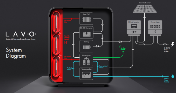 Lavo’s system works by drawing in water and using electrolyzers to separate it into its constituent atoms, namely hydrogen and oxygen. The system then stores the hydrogen in its solid state as a metal hydride powder in the silver tanks which can then be run through a traditional fuel cell to generate electricity.