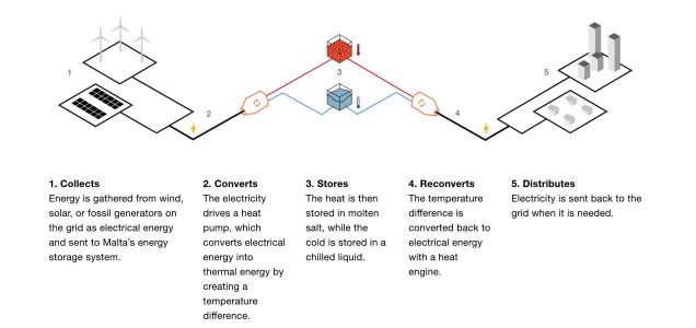 Such a system can be as small as a two-car garage or as large as a traditional power plant. The prototype created by the Malta team uses 4 vertical tanks connected by pipes to a heat pump.