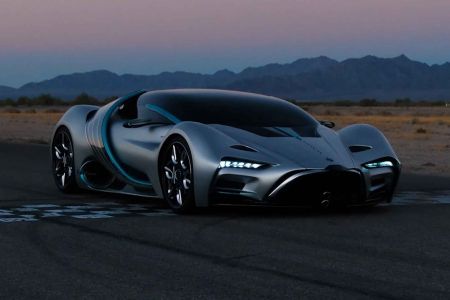 The Carbon-Titanium accented interior will also be dominated by a colossal 98-inch curved touchscreen, and if you don’t want to touch it, there will be a gesture control system as well. The seats will be carbon fiber as well, and covered in hand-stitched leather. And as for the cars outrageous looks, as you can see it’s absolutely mind blowing and one of the most aggressively out there and futuristic designs we’ve seen for a while – from the wild gold-ringed vortex air ports on the front, back and sides to the huge clear-panel roof and some truly nutty rims.