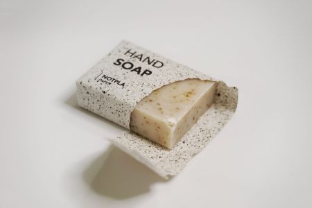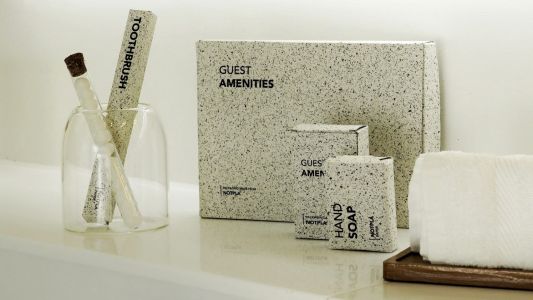 Speckled and neutrally-toned in appearance, Notpla Paper can be used to package products such as hand soap and toothbrushes, as well as to create boxes, envelopes and labels on wine bottles. Sibbel also explained that while the paper currently contains some virgin wood, Notpla aims to create entirely wood-free paper by 2024.